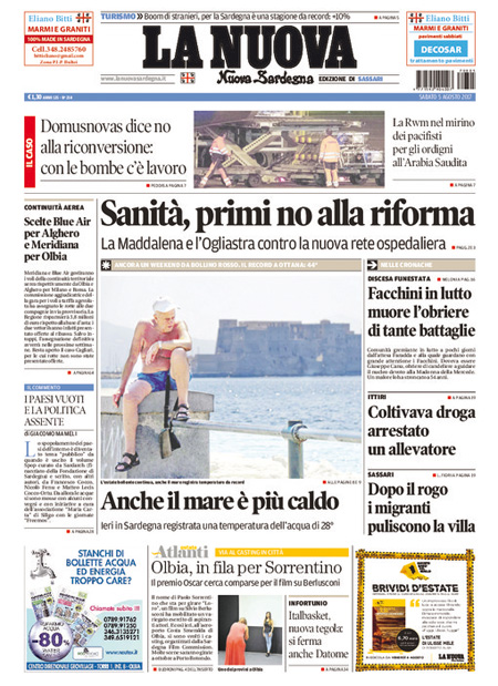RASSEGNA STAMPA 05-08-2017 Da Redazione Cagliaripad - 5 Agosto 2017 ARTICOLI CORRELATIALTRI ARTICOLI DA QUESTO AUTORE Uncategorized “Passerella rovina dune a La Caletta”, esposto cittadini Uncategorized Sardegna: da oggi sei Province e due Città metropolitane Uncategorized Comunali: slittano in autunno anche in Sardegna Uncategorized Muravera, nasce in villaggio turistico area dedicata a ospiti con disabilità Uncategorized Laconi: litigio tra automobilisti, un denunciato per danneggiamento e minacce Uncategorized Cagliari, occhio alle multe: ecco gli autovelox del mese di aprile 2021 - Pubblicità - Ultime notizie Gimbe: “Sardegna agli ultimi posti in Italia per ciclo vaccinale completato” 31 Marzo 2021 Covid in Sardegna, Gimbe: “In una settimana casi in aumento del 56,8%” 31 Marzo 2021 Festino ‘clandestino’ a Cagliari: 12 sanzioni una denuncia 31 Marzo 2021