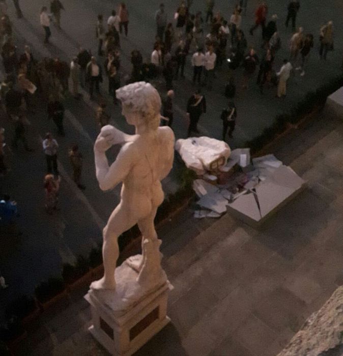 Sorpresa e un po’ di spavento, in serata in piazza della Signoria: una delle due statue di cera collocate sull’arengario di Palazzo Vecchio, che insieme al colosso metallico di oltre 10 metri sono protagoniste della mostra di Urs Fischer questa sera è crollata di colpo al suolo, tra visitatori sbigottiti e qualche persona spaventata. Nessun danno a cose o persone. Secondo il piano dell’esposizione, le due statue di cera, accese dall’interno, avrebbero dovuto sciogliersi lentamente per tutta la durata della mostra, che termina a gennaio.