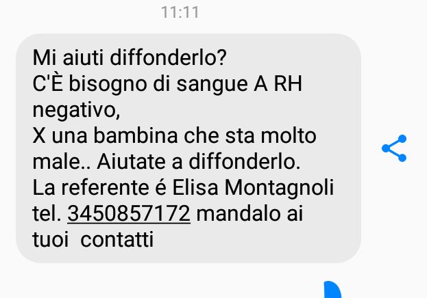 Il messaggio recita così: «Mi aiuti a diffonderlo? C’è bisogno di sangue A RH negativo per una bambi­na che sta molto male. Aiutate a diffon­derlo. La referente è Elisa Montagnoli» con tanto di no­me, cognome e numero di telefono della responsabile cui farebbe capo l’appello al­la solidarietà.
