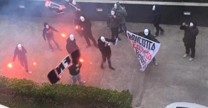 “Una pezza con scritto “Boicotta L’Espresso La Repubblica”, torce accese per “illuminare” la verità contro le menzogne dei pennivendoli di regime e maschere sul volto”.