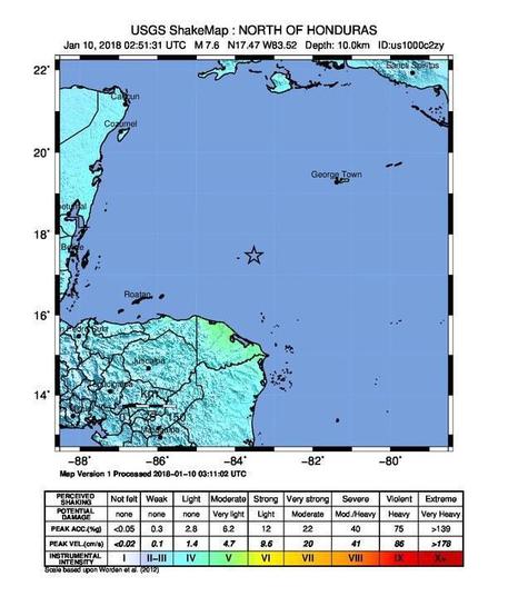 Una forte scossa di terremoto di magnitudo 7.2 è stata registrata alle 20:51 di ieri ora locale (le 3:51 in Italia) nel mar dei Caraibi. Il sisma ha avuto ipocentro a circa 10 km di profondità ed epicentro 200 km a nordest dell’honduregna Barra Patuca. Non si registrano al momento danni a persone o cose. Diramata un’allerta tsunami per Honduras, isole Cayman, Belize, Giamaica, Messico e Cuba.