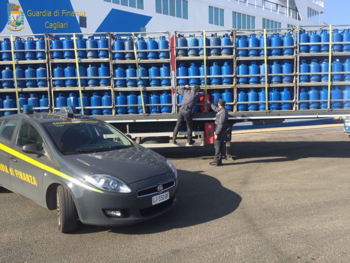 La prima parte del sequestro e’ stata operata presso il porto di Cagliari, dove le fiamme gialle hanno intercettato un semirimorchio carico di 840 bombole vuote di vario colore destinate a una ditta del continente.
