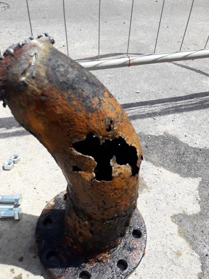 “Si tratta – si legge in una nota del Comune – di una tubatura di 350 millimetri di diametro, che è appena stata estratta, come si può notare dalla foto. Adesso si procederà con l’immediata sostituzione, al termine dei lavori si potrà nuovamente riempire la condotta e riprendere con l’erogazione idrica prevista entro stasera”.
