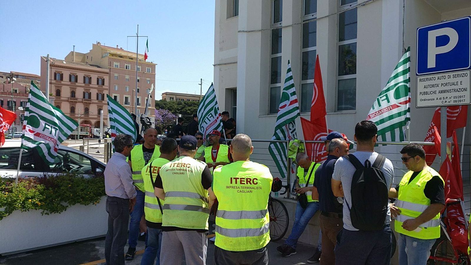 Lavoratori portuali in piazza contro per il calo dei container del porto canale di Cagliari. Il sit in questa mattina davanti alla sede dell’Autorità portuale.