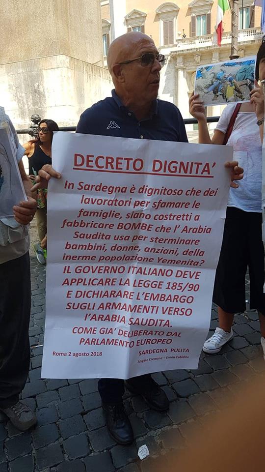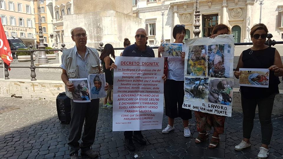 A guidare il sit in gli attivisti del movimento Angelo Cremone e Ennio Cabiddu. Con loro un cartellone con la scritta, “Decreto dignità: in Sardegna è dignitoso che dei lavoratori per sfamare le loro famiglie debbano fabbricare bombe?”. Tra le mani degli attivisti anche manifesti e fotografie con le immagini dei danni causati dalla guerra e dagli ordigni bellici nello Yemen.