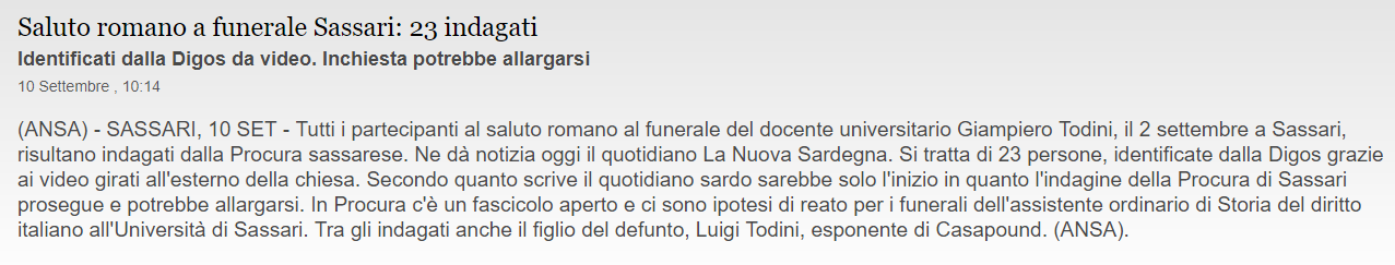 Sono 23 le persone identificate dalla Digos di Sassari che hanno partecipato, con saluto romano e bandiera di Salò sulla bara, al funerale del docente di Storia del diritto Italiano, Giampiero Todini, sul sagrato della chiesa di San Giuseppe a Sassari.