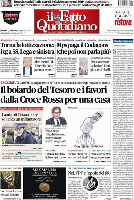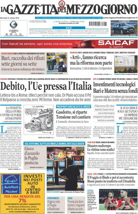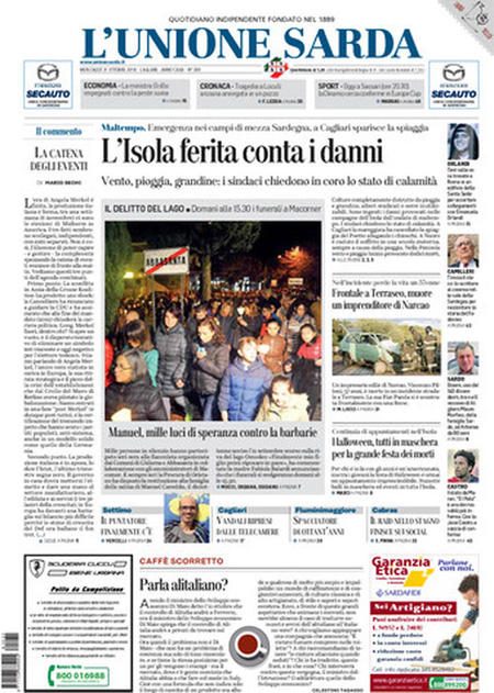Uncategorized Rassegna stampa del 31.10.2018 Rassegna stampa del 31.10.2018 Da Redazione Cagliaripad - 31 Ottobre 2018 ARTICOLI CORRELATIALTRI ARTICOLI DA QUESTO AUTORE Uncategorized “Passerella rovina dune a La Caletta”, esposto cittadini Uncategorized Sardegna: da oggi sei Province e due Città metropolitane Uncategorized Comunali: slittano in autunno anche in Sardegna Uncategorized Muravera, nasce in villaggio turistico area dedicata a ospiti con disabilità Uncategorized Laconi: litigio tra automobilisti, un denunciato per danneggiamento e minacce Uncategorized Cagliari, occhio alle multe: ecco gli autovelox del mese di aprile 2021 - Pubblicità - Ultime notizie Gimbe: “Sardegna agli ultimi posti in Italia per ciclo vaccinale completato” 31 Marzo 2021 Covid in Sardegna, Gimbe: “In una settimana casi in aumento del 56,8%” 31 Marzo 2021 Festino ‘clandestino’ a Cagliari: 12 sanzioni una denuncia 31 Marzo 2021