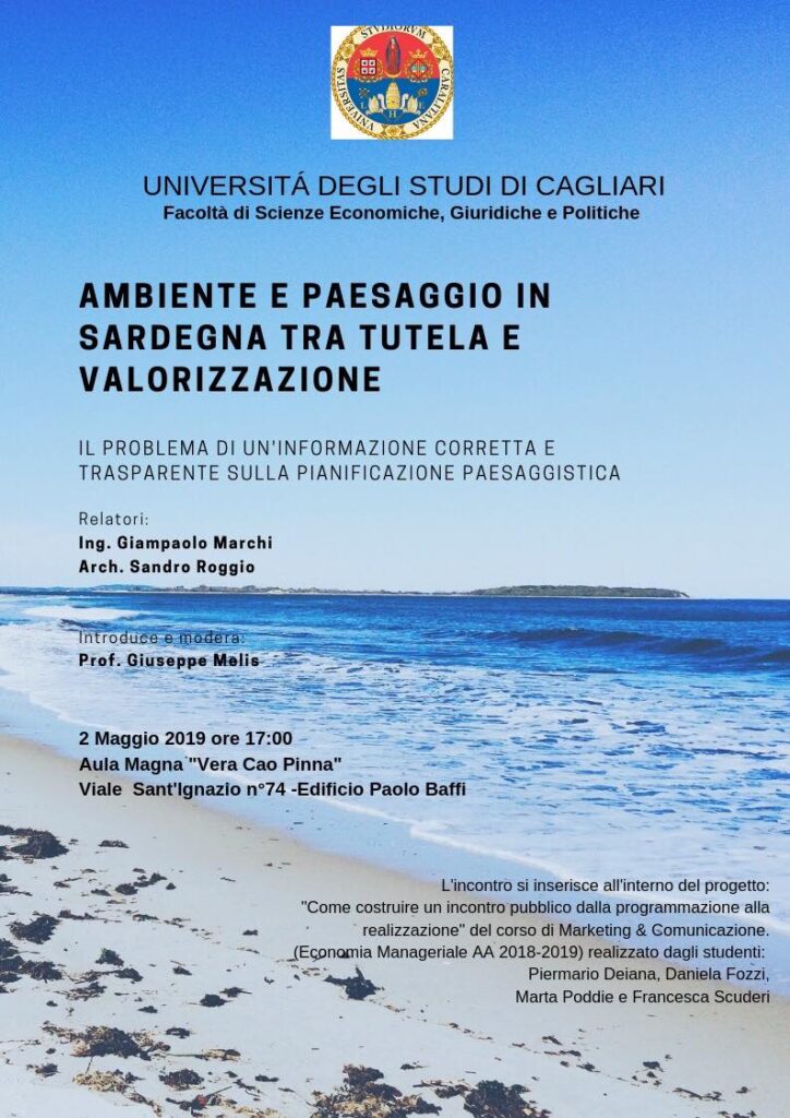Nell’ambito delle lezioni del corso di Marketing & Comunicazione, un gruppo di studenti coordinato dal prof. Giuseppe Melis, ha organizzato un incontro-dibattito sul tema: ” Ambiente e Paesaggio in Sardegna tra tutela e valorizzazione. Il problema di una informazione corretta e trasparente sulla pianificazione paesaggistica“.