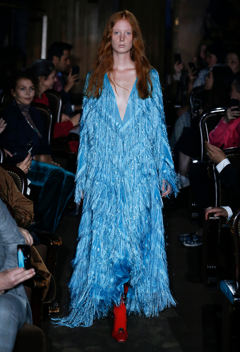 Miniabiti tutti paillettes da Elisabetta Franchi e la sera abito lungo azzurro cielo della California di Gucci, tutto frange di paillettes anche sulle maniche gonfie e con scollatura abissale sul seno.