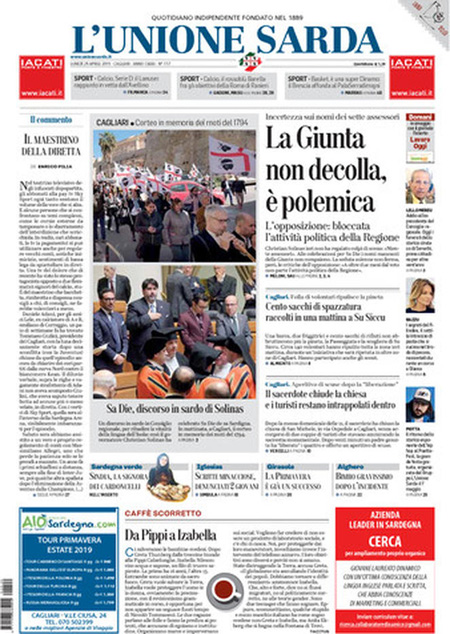 Uncategorized RASSEGNA STAMPA 29-04-2019 RASSEGNA STAMPA 29-04-2019 Da Redazione Cagliaripad - 29 Aprile 2019 ARTICOLI CORRELATIALTRI ARTICOLI DA QUESTO AUTORE Uncategorized “Passerella rovina dune a La Caletta”, esposto cittadini Uncategorized Sardegna: da oggi sei Province e due Città metropolitane Uncategorized Comunali: slittano in autunno anche in Sardegna Uncategorized Muravera, nasce in villaggio turistico area dedicata a ospiti con disabilità Uncategorized Laconi: litigio tra automobilisti, un denunciato per danneggiamento e minacce Uncategorized Cagliari, occhio alle multe: ecco gli autovelox del mese di aprile 2021 - Pubblicità - Ultime notizie Gimbe: “Sardegna agli ultimi posti in Italia per ciclo vaccinale completato” 31 Marzo 2021 Covid in Sardegna, Gimbe: “In una settimana casi in aumento del 56,8%” 31 Marzo 2021 Festino ‘clandestino’ a Cagliari: 12 sanzioni una denuncia 31 Marzo 2021