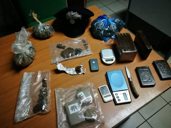 I due sono stati controllati dai militari e dopo la perquisizione in casa del pregiudicato è stato trovato oltre un 1,5 kg di sostanza stupefacente del tipo hashish, di cui 13 panetti integri e diverse dosi di piccole quantità, un bilancino di precisione e un coltello a serramanico di oltre 20 cm.