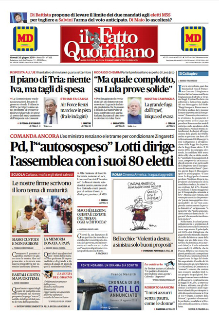 Uncategorized Rassegna stampa 20.06.2019 Rassegna stampa 20.06.2019 Da Redazione Cagliaripad - 20 Giugno 2019 ARTICOLI CORRELATIALTRI ARTICOLI DA QUESTO AUTORE Uncategorized “Passerella rovina dune a La Caletta”, esposto cittadini Uncategorized Sardegna: da oggi sei Province e due Città metropolitane Uncategorized Comunali: slittano in autunno anche in Sardegna Uncategorized Muravera, nasce in villaggio turistico area dedicata a ospiti con disabilità Uncategorized Laconi: litigio tra automobilisti, un denunciato per danneggiamento e minacce Uncategorized Cagliari, occhio alle multe: ecco gli autovelox del mese di aprile 2021 - Pubblicità - Ultime notizie Gimbe: “Sardegna agli ultimi posti in Italia per ciclo vaccinale completato” 31 Marzo 2021 Covid in Sardegna, Gimbe: “In una settimana casi in aumento del 56,8%” 31 Marzo 2021 Festino ‘clandestino’ a Cagliari: 12 sanzioni una denuncia 31 Marzo 2021
