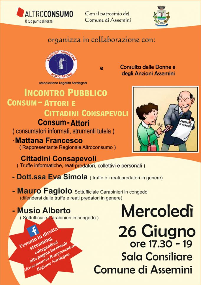 L’iniziativa con il patrocinio dell’Amministrazione Comunale di Assemini in collaborazione con l’associazione “Legalità Sardegna” l’associazione “Altro Consumo” e la “consulta delle donne e degli anziani Assemini“ si svolgerà mercoledì 26 giugno nella sala consiliare del Comune.