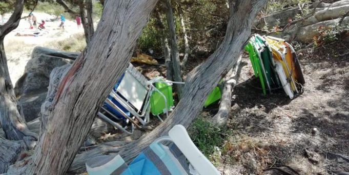 Ombrelloni e lettini accatastati nottetempo in uno degli angoli più suggestivi della costa di Golfo Aranci, legati con catena e lucchetti a un ginepro. È la scoperta fatta dalla Guardia costiera sulla spiaggia di Baia de Bahas.