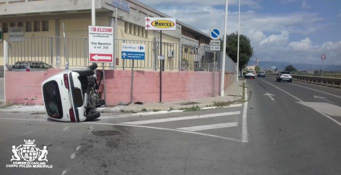La seicento si è ribaltata sulla fiancata sinistra e dopo avere strisciato per una decina di metri è andata a urtare il muro di recinzione del supermarket all’angolo tra via Mercalli e la strada arginale Terramaini.