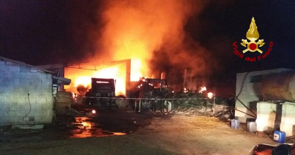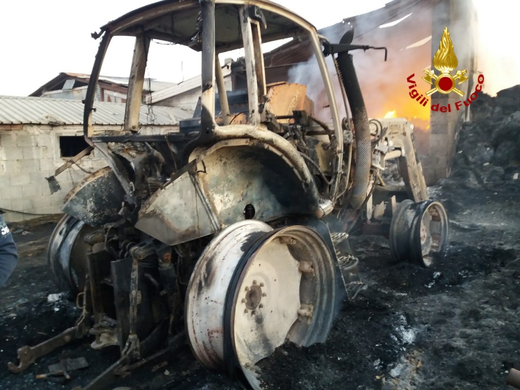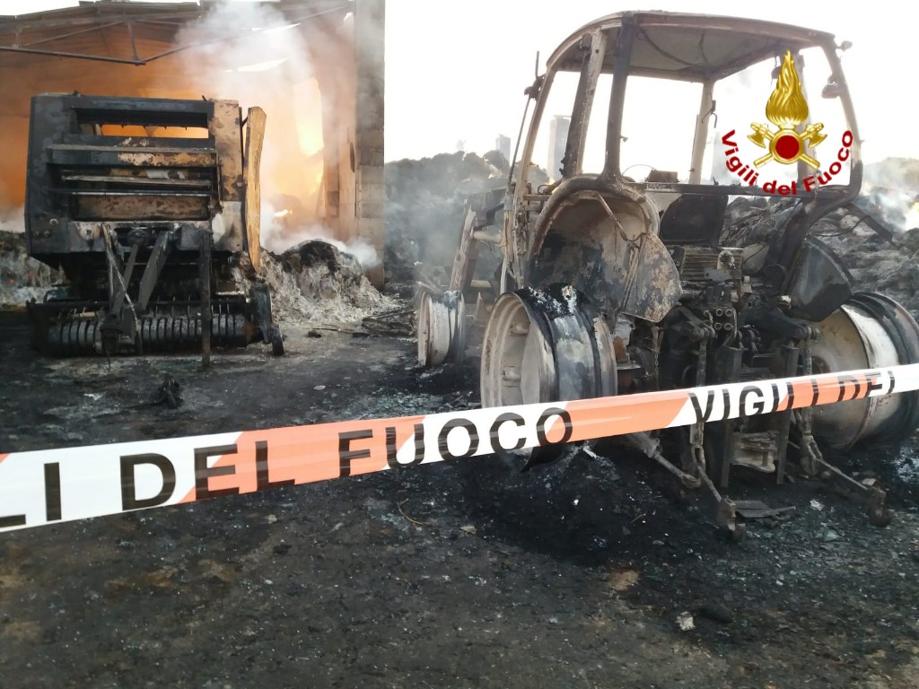 Le fiamme, divampate nella notte all’interno della struttura, hanno coinvolto alcuni mezzi agricoli e delle rotoballe di foraggio. I vigili del fuoco hanno spento il rogo e messo in sicurezza l’area.