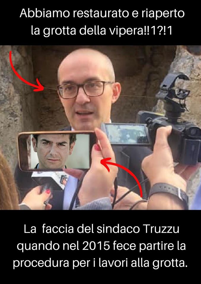 “È incredibile – è il commento di Mulas – come si possa cambiare in pochi anni, saranno gli impegni, il tempo che passa, le mezze stagioni che non ci sono più… Nella foto vediamo il sindaco che oggi ha riaperto la Grotta della Vipera a Cagliari, affermando “è il primo di tanti siti che offriremo alla fruibilità di tutti i cittadini”. Nel piccolo schermo, il sindaco che 4 anni fa ha progettato e finanziato i lavori”.