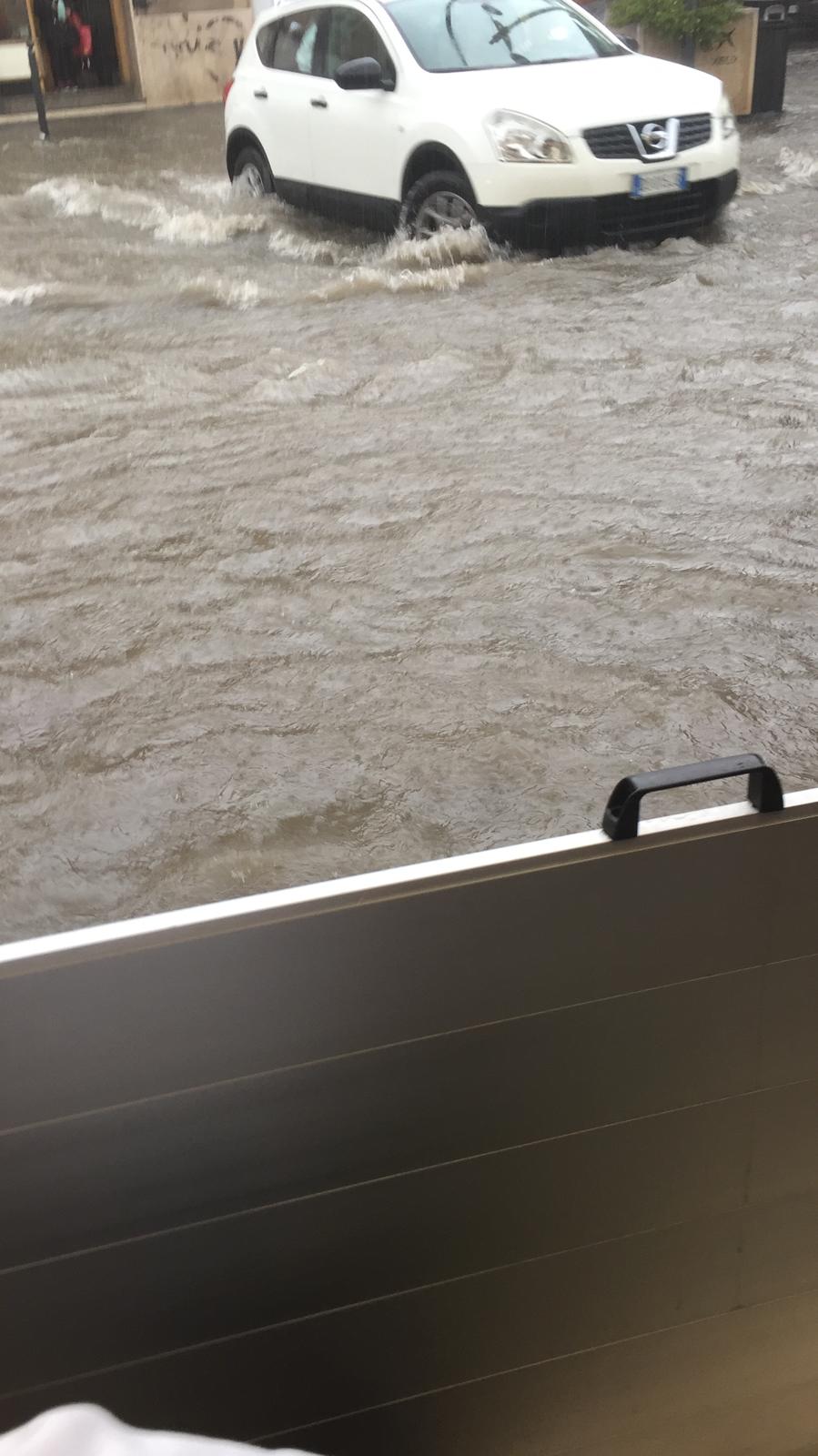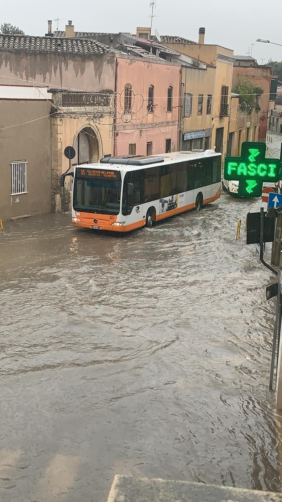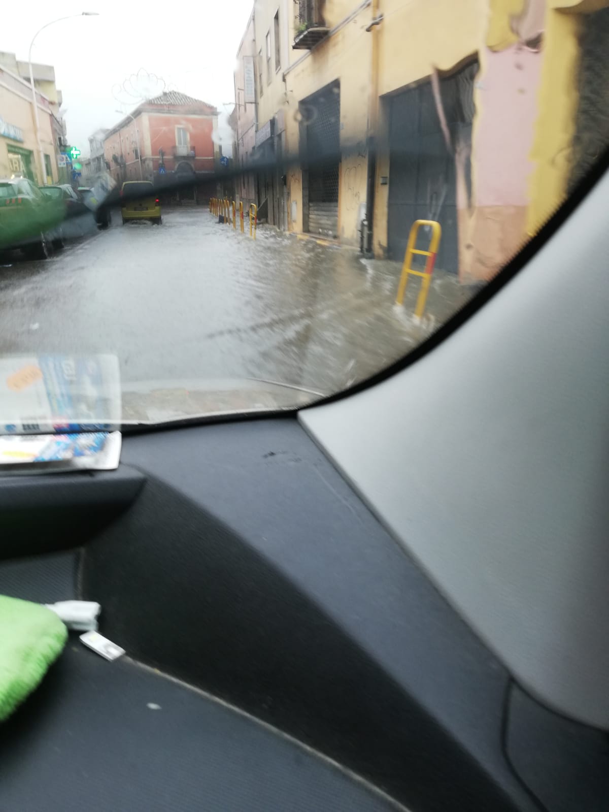 E, nonostante i lavori di messa in sicurezza dal rischio idrogeologico, le vie del centro di Pirri (Balilla, Santa Maria Chiara, Italia) sono già parzialmente allagate: