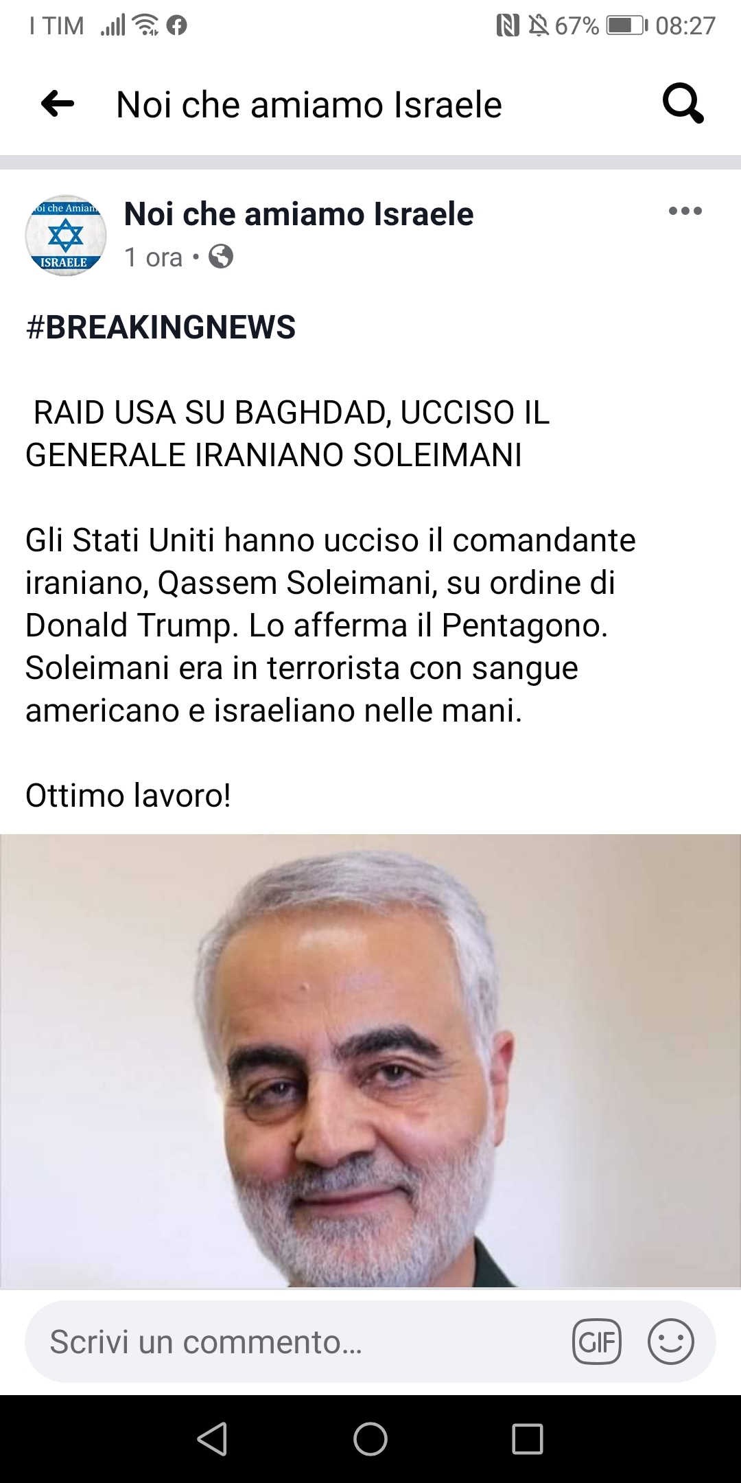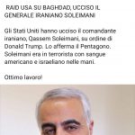 “Gli Stati Uniti hanno ucciso il comandante iraniano, Qassem Soleimani, su ordine di Donald Trump. Lo afferma il Pentagono. Soleimani era in terrorista con sangue americano e israeliano nelle mani. Ottimo lavoro!”, questo il post condiviso dal consulente di Solinas.