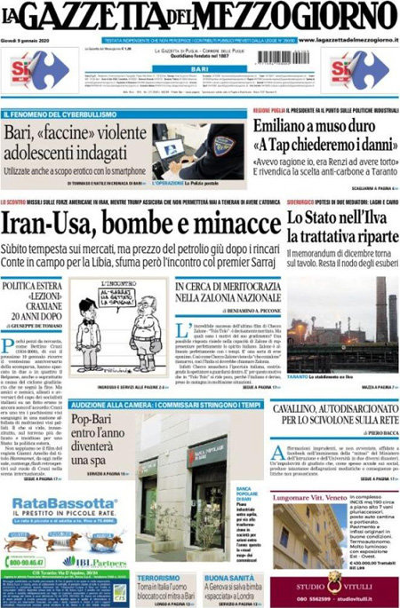 Uncategorized Rassegna stampa del 09.01.2020 Rassegna stampa del 09.01.2020 Da Redazione Cagliaripad (Archivio) - 9 Gennaio 2020 TES TES ARTICOLI CORRELATIALTRI ARTICOLI DA QUESTO AUTORE Uncategorized “Passerella rovina dune a La Caletta”, esposto cittadini Uncategorized Sardegna: da oggi sei Province e due Città metropolitane Uncategorized Comunali: slittano in autunno anche in Sardegna Uncategorized Muravera, nasce in villaggio turistico area dedicata a ospiti con disabilità Uncategorized Laconi: litigio tra automobilisti, un denunciato per danneggiamento e minacce Uncategorized Cagliari, occhio alle multe: ecco gli autovelox del mese di aprile 2021 - Pubblicità - Ultime notizie Gimbe: “Sardegna agli ultimi posti in Italia per ciclo vaccinale completato” 31 Marzo 2021 Covid in Sardegna, Gimbe: “In una settimana casi in aumento del 56,8%” 31 Marzo 2021 Festino ‘clandestino’ a Cagliari: 12 sanzioni una denuncia 31 Marzo 2021