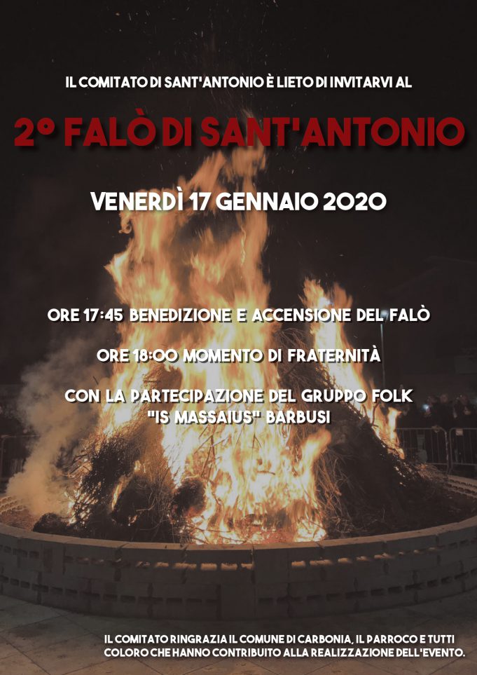 Dopo il grande successo della prima edizione, venerdì 17 Gennaio alle ore 17.45, a Barbusi, presso la piazzetta antistante la Chiesa, si svolgerà il 2° Falò di Sant’Antonio Abate, un’iniziativa organizzata dal Comitato di Sant’Antonio in collaborazione con la Parrocchia Beata Vergine delle Grazie e con il patrocinio del Comune di Carbonia.
