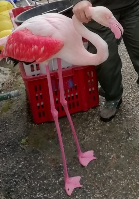 Fenicottero in difficoltà salvato dai barracelli, a Stintino. Gli operatori intervenuti lo hanno trovato stremato dalla fatica e hanno deciso di tenerlo in custodia una notte, prima di consegnarlo al Centro recupero fauna di Bonassai.