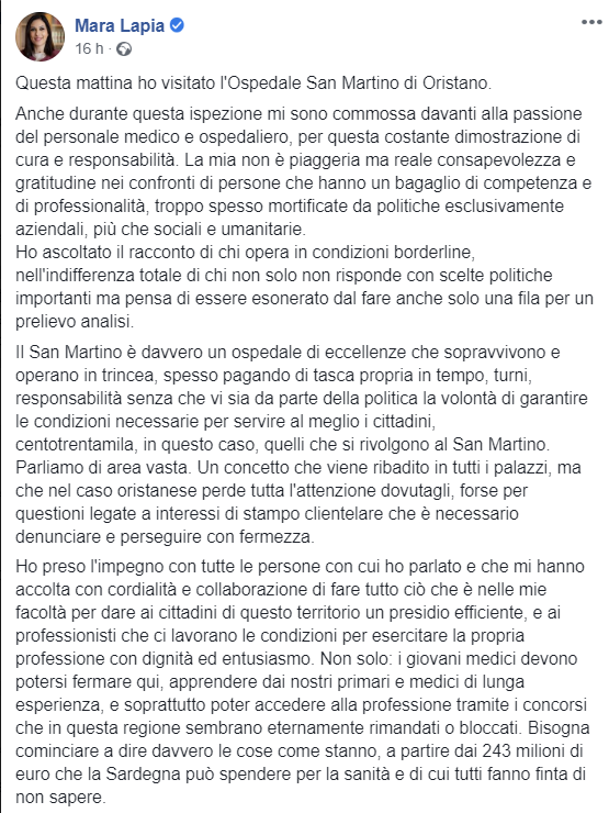 “Ho potuto toccare con mano la competenza e la professionalità del personale, troppo spesso mortificate da politiche esclusivamente aziendali, più che sociali e umanitarie”. Queste le parole della deputata del Movimento 5 Stelle e membro della Commissione sanità Mara Lapia, a seguito di un’ispezione all’ospedale San Martino di Oristano.