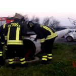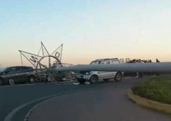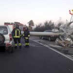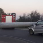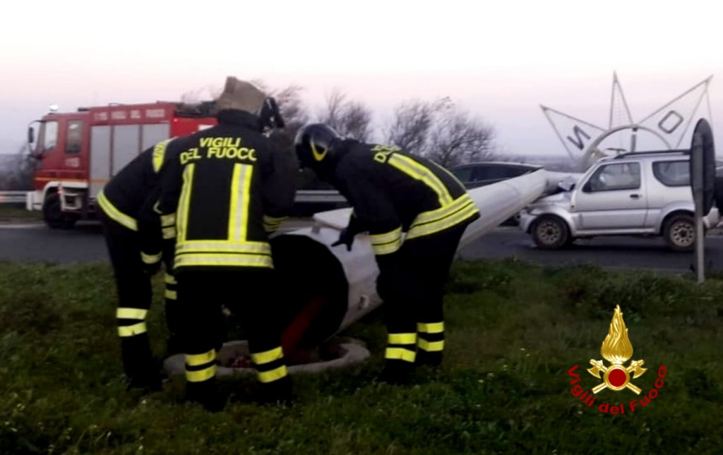 Il personale Anas e i vigili del fuoco sono sul posto per le operazioni di rimozione della torre faro abbattuta. Il grosso palo infatti blocca la strada, costringendo le auto a passare in contromano rispetto alla rotonda.