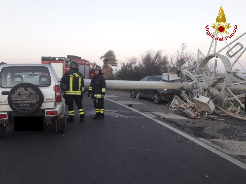 Una torre faro di una rotonda della SS195, vicino a Macchiareddu, a causa del forte vento di Maestrale è crollata in mezzo alla strada, colpendo sul cofano un’auto, fortunatamente senza conseguenze per gli occupanti.
