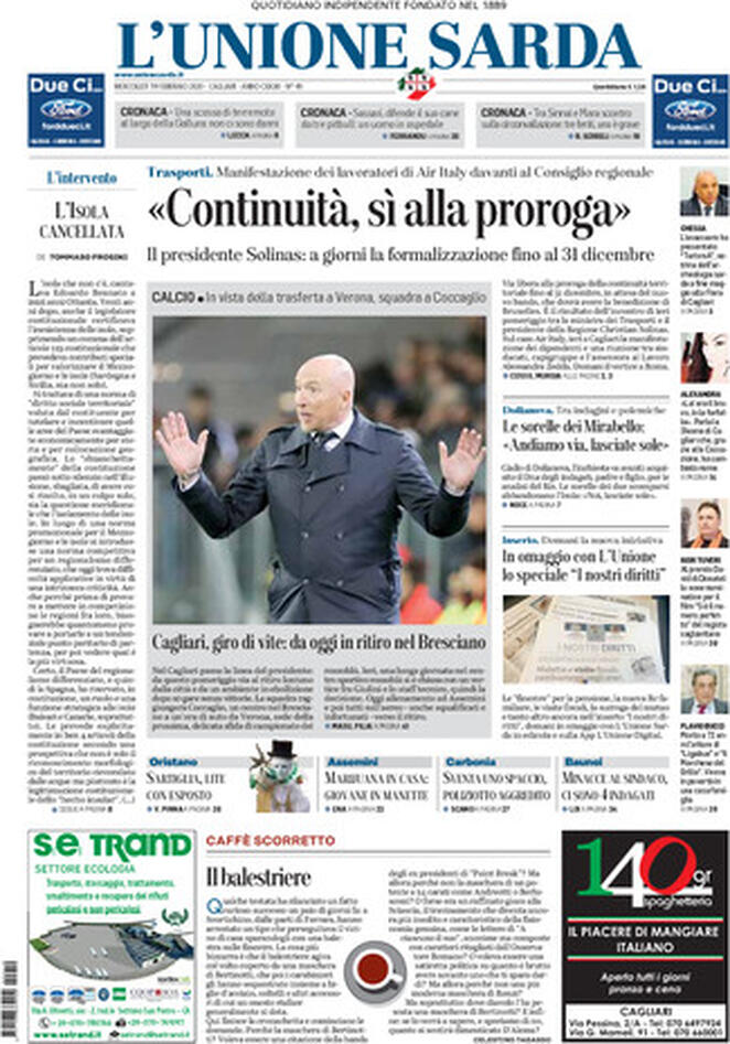 Uncategorized Rassegna stampa 19.02.2020 Rassegna stampa 19.02.2020 Da Redazione Cagliaripad - 19 Febbraio 2020 ARTICOLI CORRELATIALTRI ARTICOLI DA QUESTO AUTORE Uncategorized “Passerella rovina dune a La Caletta”, esposto cittadini Uncategorized Sardegna: da oggi sei Province e due Città metropolitane Uncategorized Comunali: slittano in autunno anche in Sardegna Uncategorized Muravera, nasce in villaggio turistico area dedicata a ospiti con disabilità Uncategorized Laconi: litigio tra automobilisti, un denunciato per danneggiamento e minacce Uncategorized Cagliari, occhio alle multe: ecco gli autovelox del mese di aprile 2021 - Pubblicità - Ultime notizie Gimbe: “Sardegna agli ultimi posti in Italia per ciclo vaccinale completato” 31 Marzo 2021 Covid in Sardegna, Gimbe: “In una settimana casi in aumento del 56,8%” 31 Marzo 2021 Festino ‘clandestino’ a Cagliari: 12 sanzioni una denuncia 31 Marzo 2021