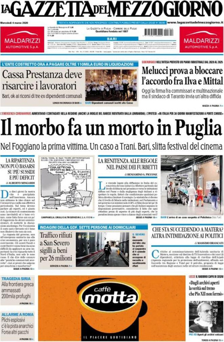 Uncategorized Rassegna stampa del 04.03.2020 Rassegna stampa del 04.03.2020 Da Redazione Cagliaripad (Archivio) - 4 Marzo 2020 TES TES ARTICOLI CORRELATIALTRI ARTICOLI DA QUESTO AUTORE Uncategorized “Passerella rovina dune a La Caletta”, esposto cittadini Uncategorized Sardegna: da oggi sei Province e due Città metropolitane Uncategorized Comunali: slittano in autunno anche in Sardegna Uncategorized Muravera, nasce in villaggio turistico area dedicata a ospiti con disabilità Uncategorized Laconi: litigio tra automobilisti, un denunciato per danneggiamento e minacce Uncategorized Cagliari, occhio alle multe: ecco gli autovelox del mese di aprile 2021 - Pubblicità - Ultime notizie Gimbe: “Sardegna agli ultimi posti in Italia per ciclo vaccinale completato” 31 Marzo 2021 Covid in Sardegna, Gimbe: “In una settimana casi in aumento del 56,8%” 31 Marzo 2021 Festino ‘clandestino’ a Cagliari: 12 sanzioni una denuncia 31 Marzo 2021