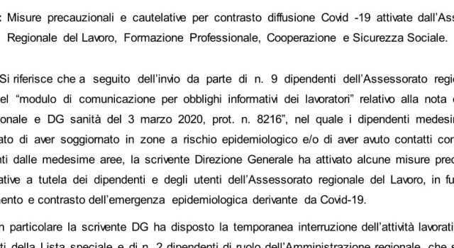 “Si riferisce che a seguito dell’invio da parte di 9 dipendenti dell’Assessorato regionale del Lavoro del modulo di ‘comunicazione per obblighi informativi dei lavoratori’ relativo alla nota congiunta del DG personale e del DG sanità del 3 marzo 2020, prot. n. 8216, nel quale i dipendenti medesimi hanno comunicato di aver soggiornato in zone a rischio epidemiologico e/o di aver avuto contatti con persone provenienti dalle medesime aree, la scrivente Direzione Generale – si legge nella nota – ha attivato alcune misure precauzionali e cautelative a tutela dei dipendenti e degli utenti dell’Assessorato regionale del Lavoro, in funzione di contenimento e contrasto dell’emergenza epidemiologica derivante da Covid-19”.
