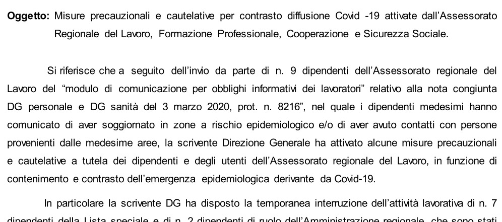 “Si riferisce che a seguito dell’invio da parte di 9 dipendenti dell’Assessorato regionale del Lavoro del modulo di ‘comunicazione per obblighi informativi dei lavoratori’ relativo alla nota congiunta del DG personale e del DG sanità del 3 marzo 2020, prot. n. 8216, nel quale i dipendenti medesimi hanno comunicato di aver soggiornato in zone a rischio epidemiologico e/o di aver avuto contatti con persone provenienti dalle medesime aree, la scrivente Direzione Generale – si legge nella nota – ha attivato alcune misure precauzionali e cautelative a tutela dei dipendenti e degli utenti dell’Assessorato regionale del Lavoro, in funzione di contenimento e contrasto dell’emergenza epidemiologica derivante da Covid-19”.