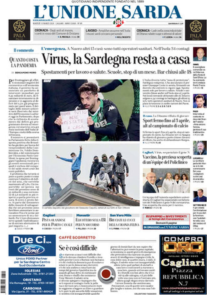 Uncategorized Rassegna stampa 10.03.2020 Rassegna stampa 10.03.2020 Da Redazione Cagliaripad - 10 Marzo 2020 ARTICOLI CORRELATIALTRI ARTICOLI DA QUESTO AUTORE Uncategorized “Passerella rovina dune a La Caletta”, esposto cittadini Uncategorized Sardegna: da oggi sei Province e due Città metropolitane Uncategorized Comunali: slittano in autunno anche in Sardegna Uncategorized Muravera, nasce in villaggio turistico area dedicata a ospiti con disabilità Uncategorized Laconi: litigio tra automobilisti, un denunciato per danneggiamento e minacce Uncategorized Cagliari, occhio alle multe: ecco gli autovelox del mese di aprile 2021 - Pubblicità - Ultime notizie Gimbe: “Sardegna agli ultimi posti in Italia per ciclo vaccinale completato” 31 Marzo 2021 Covid in Sardegna, Gimbe: “In una settimana casi in aumento del 56,8%” 31 Marzo 2021 Festino ‘clandestino’ a Cagliari: 12 sanzioni una denuncia 31 Marzo 2021