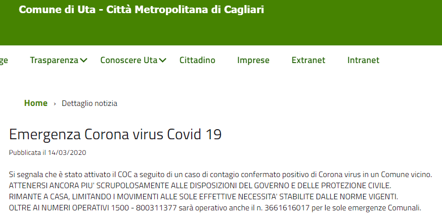 “Il comune ha stato attivato il COC a seguito di un caso di contagio confermato positivo di coronavirus in un Comune vicino”. Lo scrive in una nota il Comune di Uta.