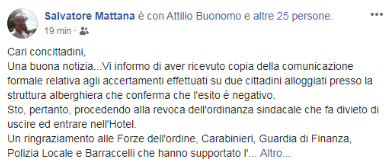 “Vi informo di aver ricevuto copia della comunicazione formale relativa agli accertamenti effettuati su due cittadini alloggiati presso la struttura alberghiera che conferma che l’esito è negativo”.