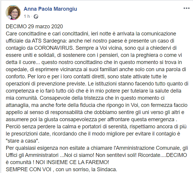 “Ieri notte è arrivata la comunicazione ufficiale da ATS Sardegna: anche nel nostro paese è presente un caso di contagio da coronavirus”. Lo scrive Anna Paola Marongiu, sindachessa di Decimonannu sul suo profilo Facebook.