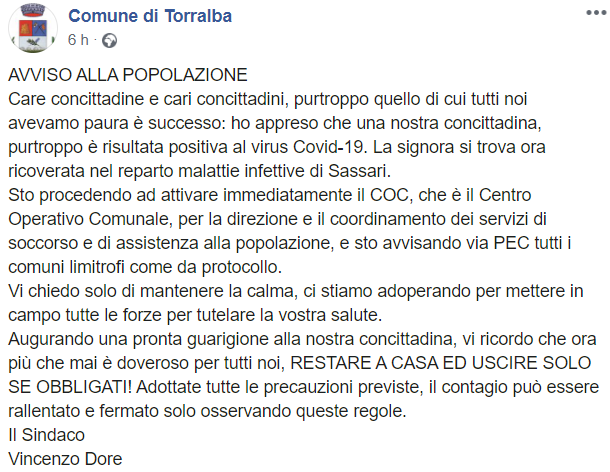 “La signora – assicura il primo cittadino – si trova ora ricoverata nel reparto malattie infettive di Sassari. Sto procedendo ad attivare immediatamente il COC, che è il Centro Operativo Comunale, per la direzione e il coordinamento dei servizi di soccorso e di assistenza alla popolazione, e sto avvisando via PEC tutti i comuni limitrofi come da protocollo. Vi chiedo solo di mantenere la calma, ci stiamo adoperando per mettere in campo tutte le forze per tutelare la vostra salute”.