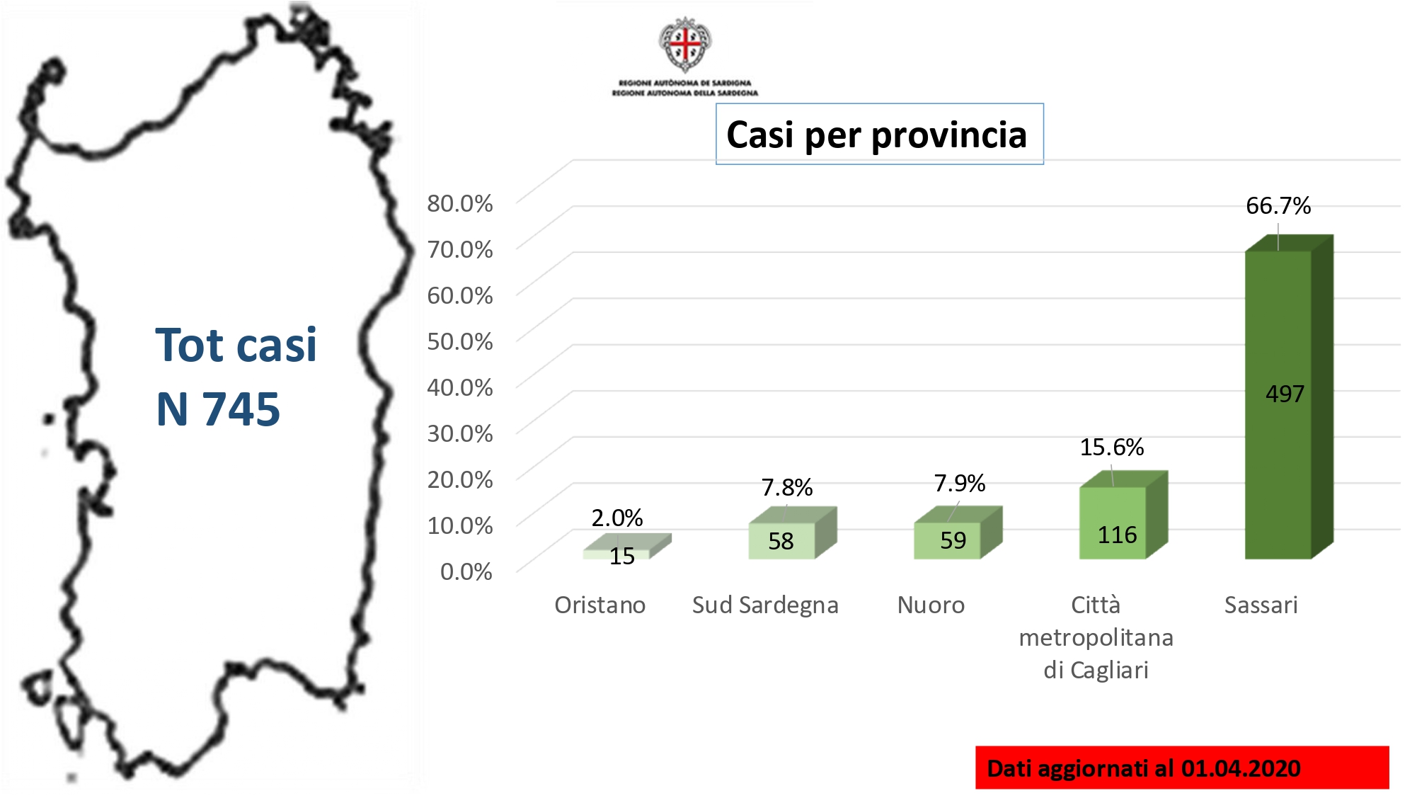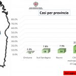 Sul territorio, dei 745 casi positivi complessivamente accertati, 116 sono stati registrati nella Città Metropolitana di Cagliari (+5 rispetto al dato precedente), 58 nel Sud Sardegna, 15 (+5) a Oristano, 59 (+2) a Nuoro, 497 (+11) a Sassari.