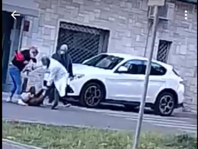 Quest’ultima tenta disperatamente di fermare il medico mentre l’anziano è a terra.