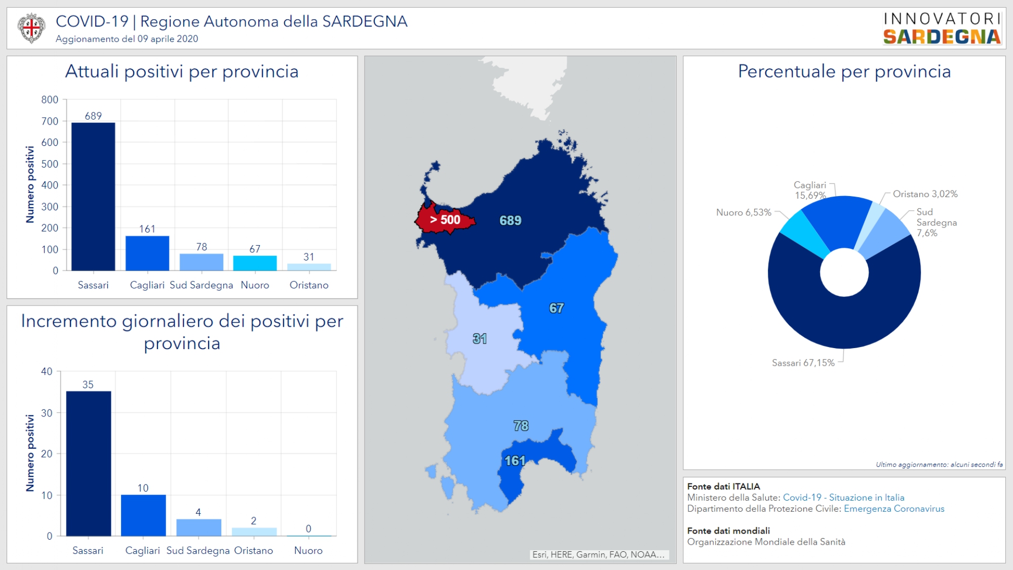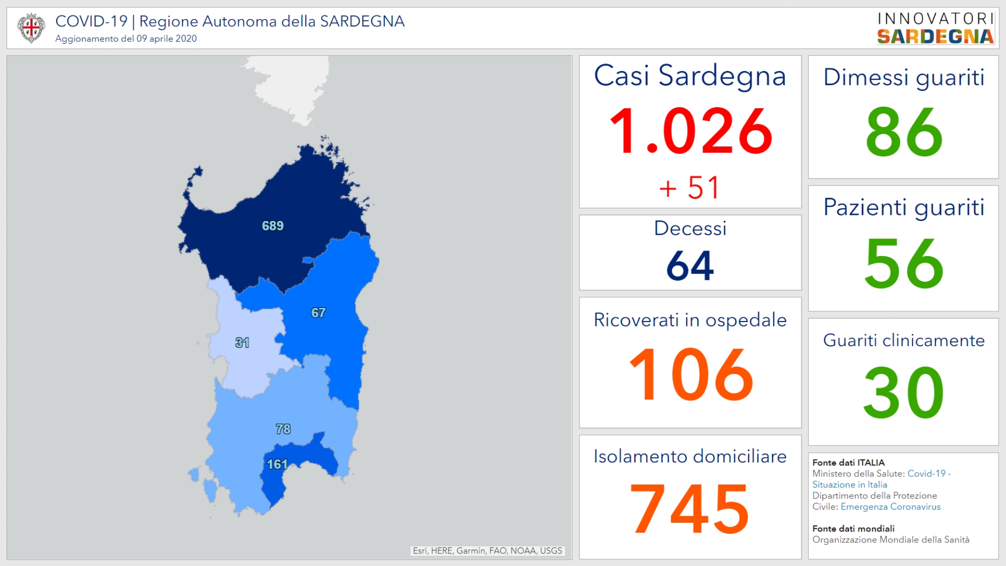 Sul territorio, dei 1.026 casi positivi complessivamente accertati, 161 sono stati registrati nella Città Metropolitana di Cagliari (+10 rispetto all’ultimo aggiornamento), 78 (+4) nel Sud Sardegna, 31 (+2) a Oristano, 67 a Nuoro, 689 (+35) a Sassari.