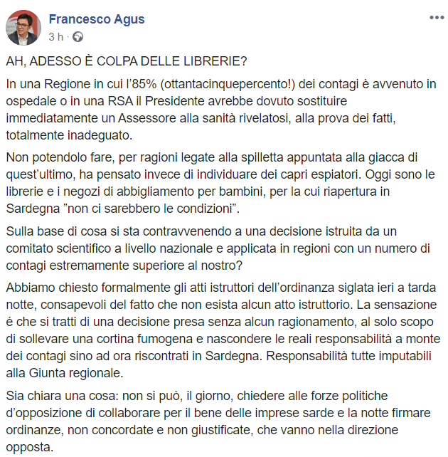 “In una Regione in cui l’85% dei contagi è avvenuto in ospedale o in una RSA il Presidente avrebbe dovuto sostituire immediatamente un Assessore alla sanità rivelatosi, alla prova dei fatti, totalmente inadeguato. Non potendolo fare, per ragioni legate alla spilletta appuntata alla giacca di quest’ultimo, ha pensato invece di individuare dei capri espiatori. Oggi sono le librerie e i negozi di abbigliamento per bambini, per la cui riapertura in Sardegna secondo Solinas non ci sarebbero le condizioni”. Lo scrive in una nota sul suo profilo Facebook Francesco Agus, consigliere regionale dei Progressisti.