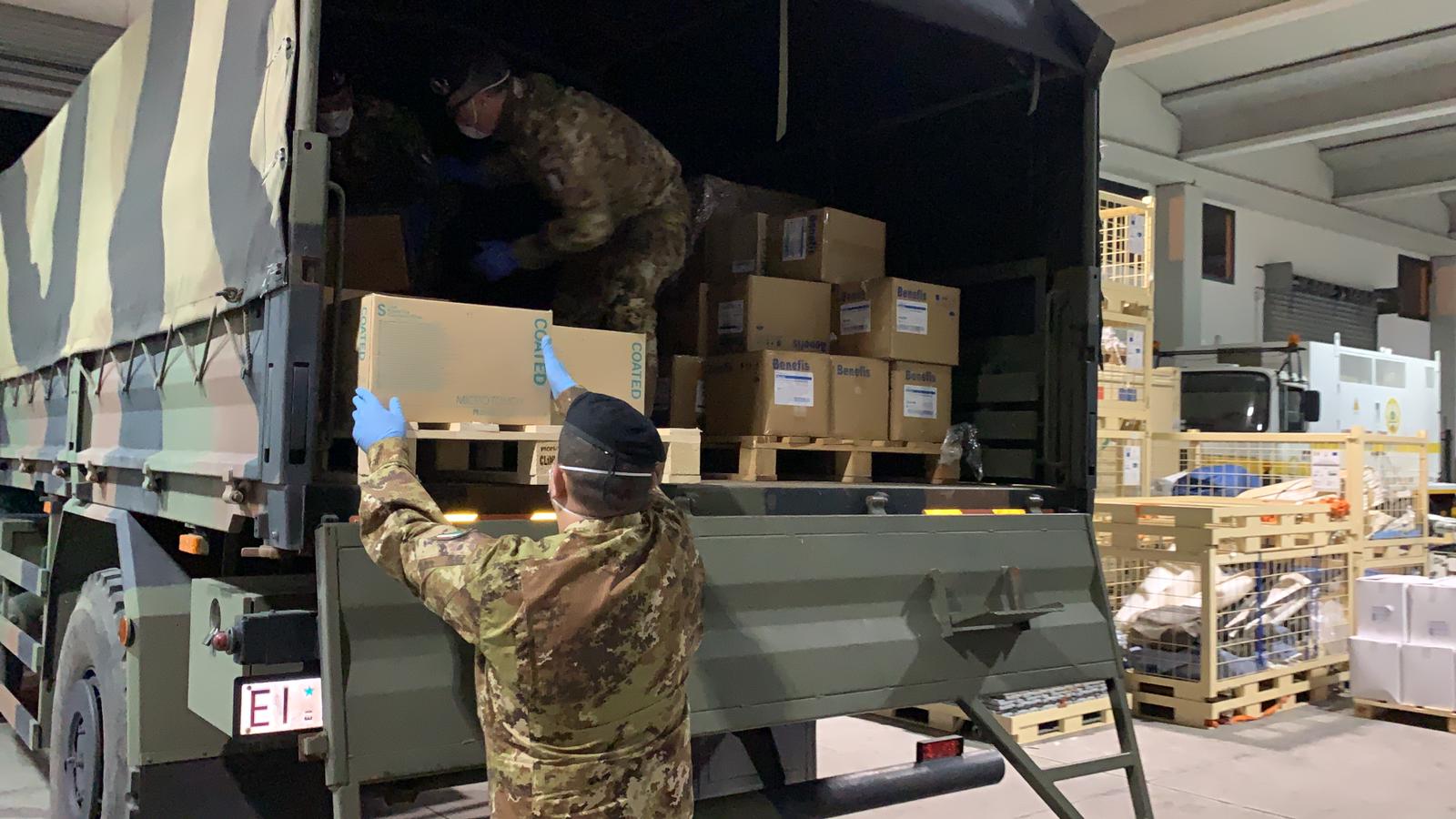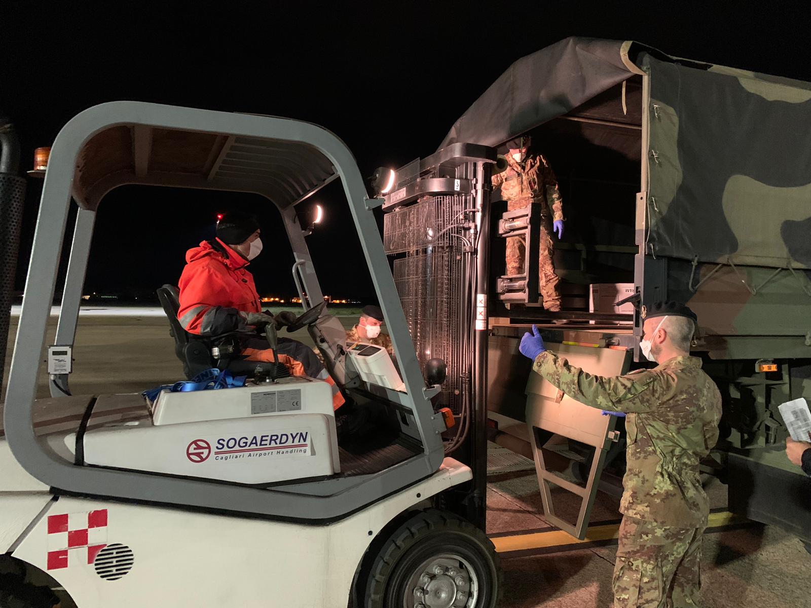 All’arrivo nell’isola i colli sono stati scaricati dai militari della Brigata “Sassari” che li hanno trasportati fino al sito di stoccaggio della Protezione Civile a Macchiareddu, da dove, successivamente, partiranno per distribuirli non solo nelle strutture sanitarie e in quelle per anziani, ma anche negli enti locali di tutta la Sardegna.