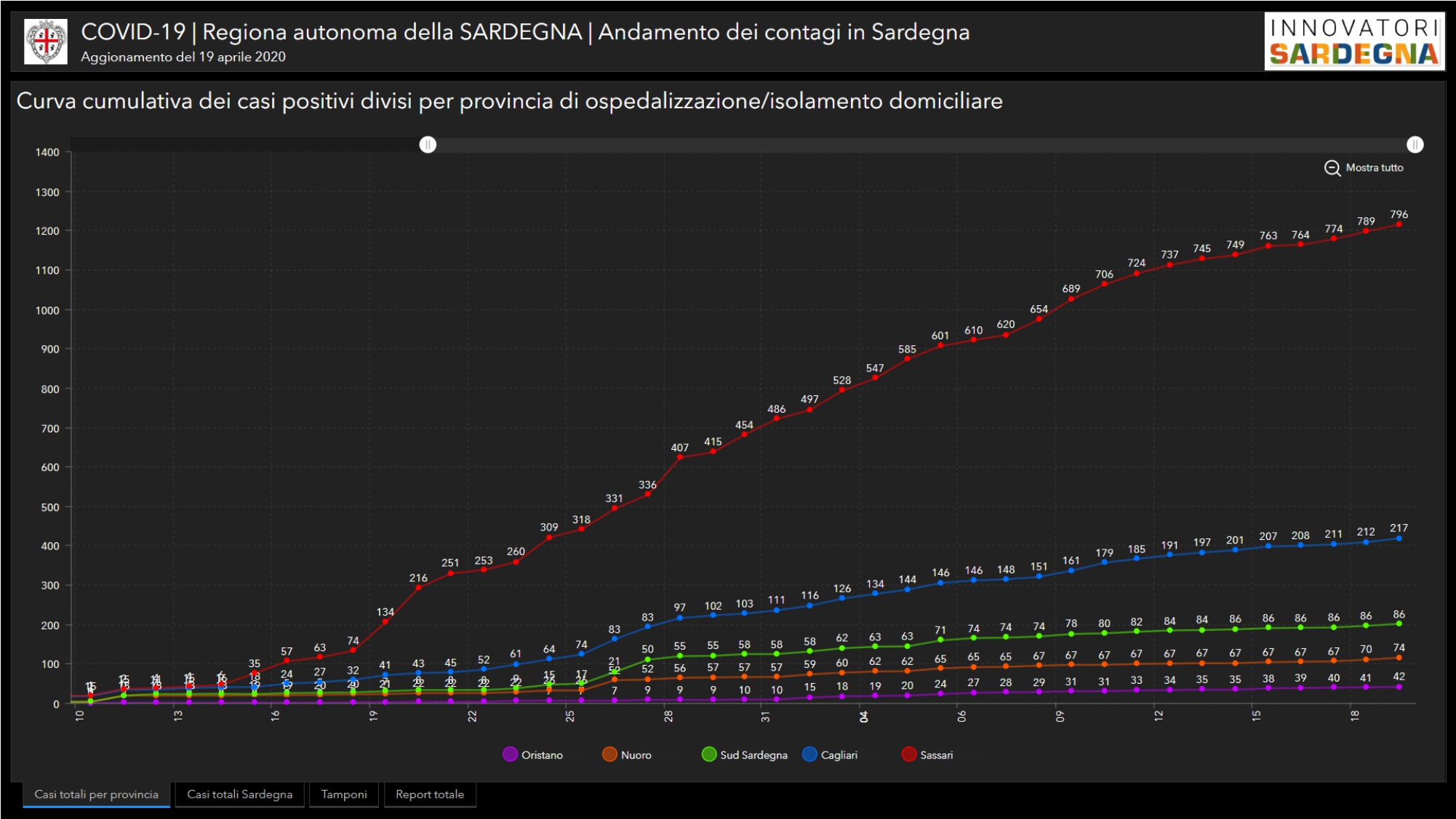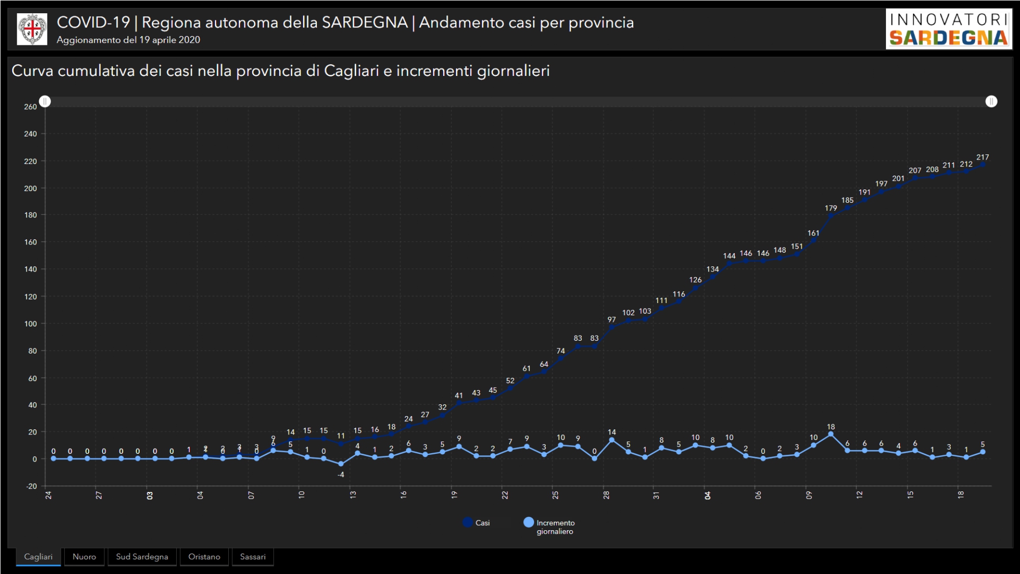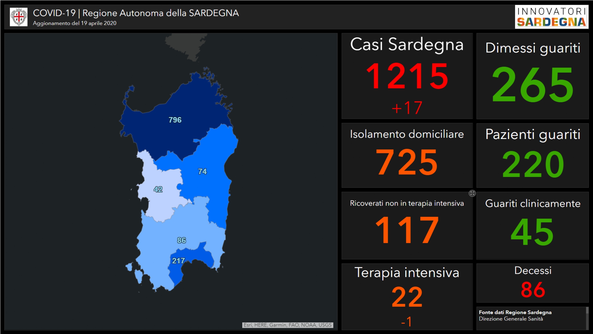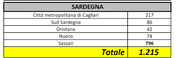 Sul territorio, dei 1.215 casi positivi complessivamente accertati, 217 sono stati registrati nella Città Metropolitana di Cagliari (+5 rispetto all’ultimo aggiornamento), 86 nel Sud Sardegna, 42 (+1) a Oristano, 74 a Nuoro (+4), 796 (+7) a Sassari.