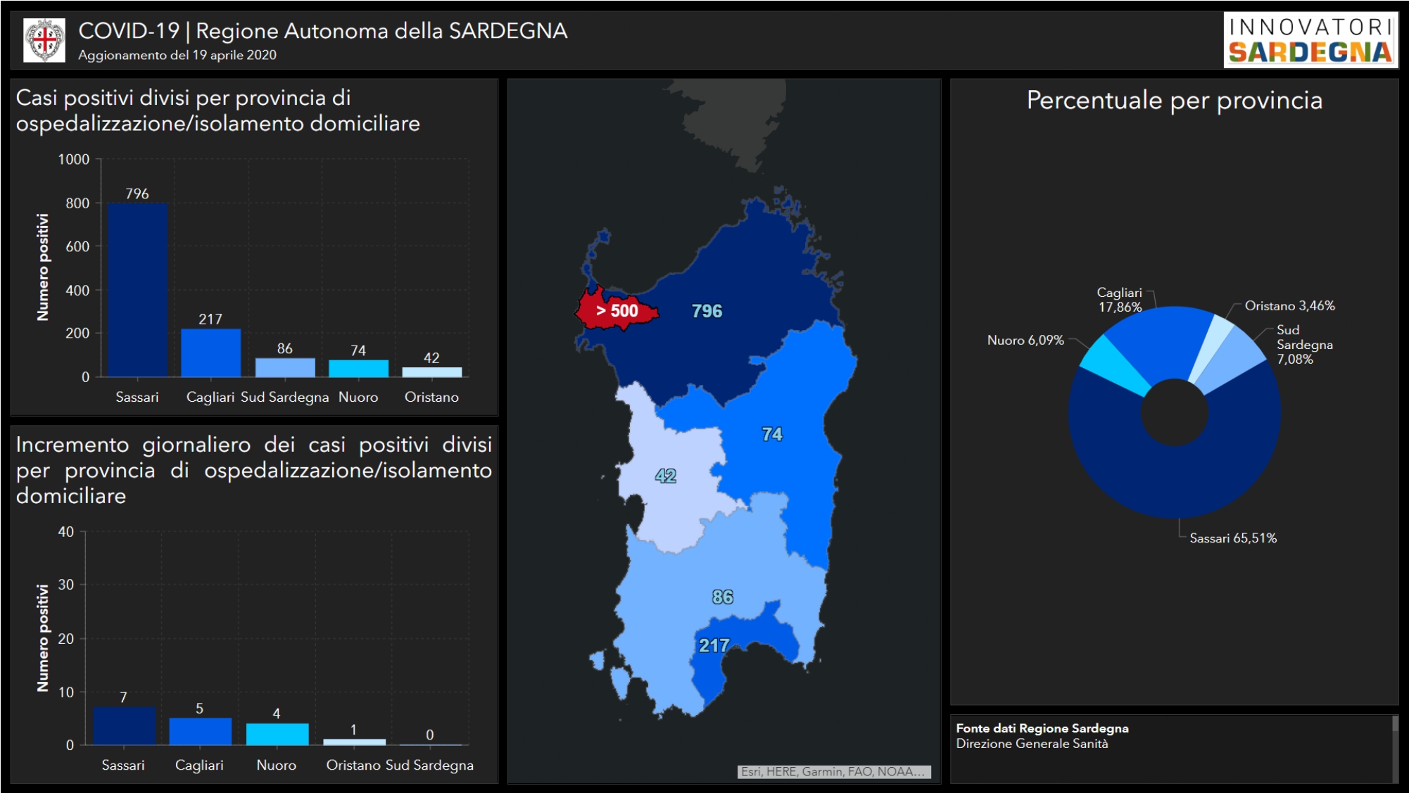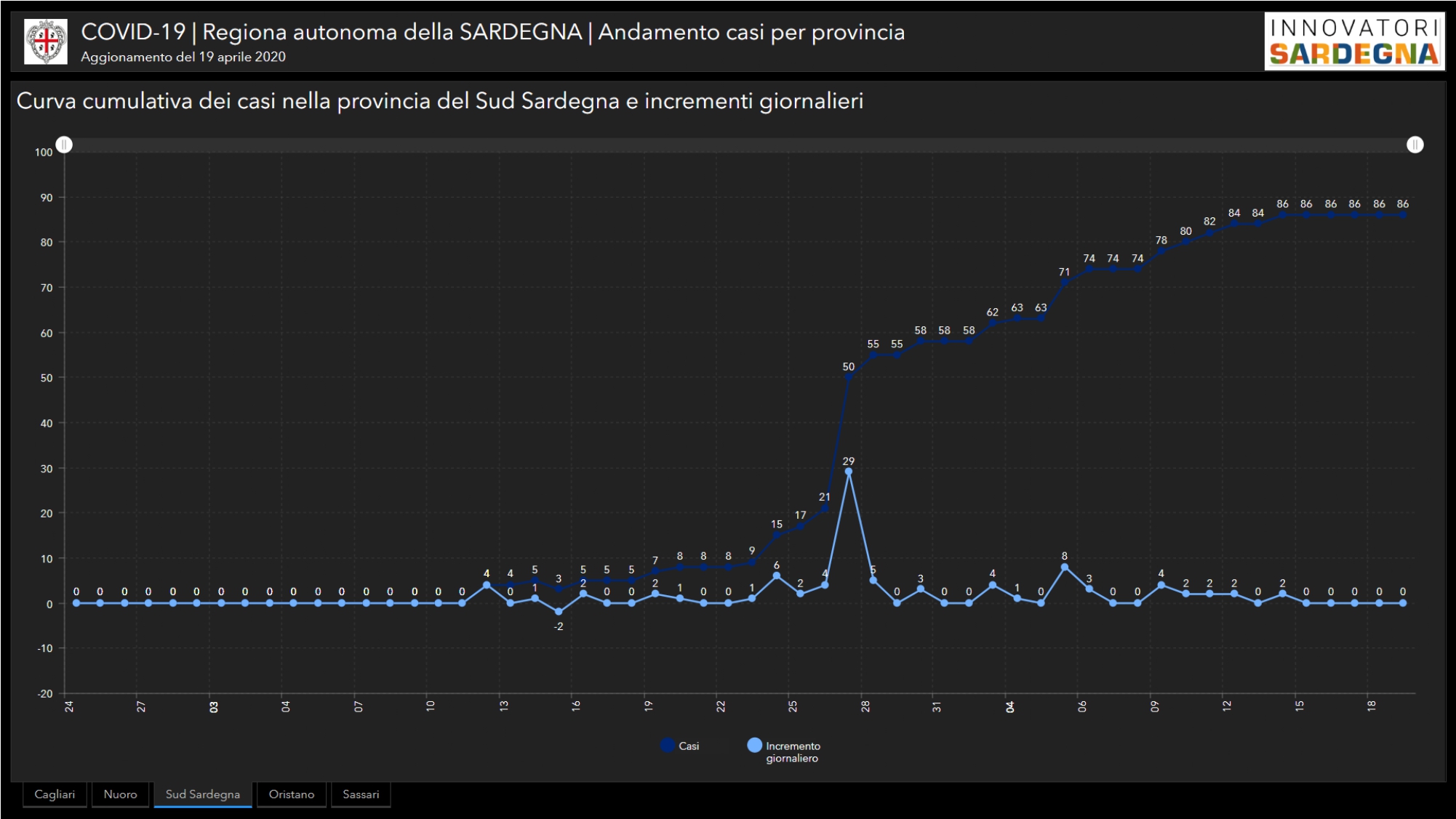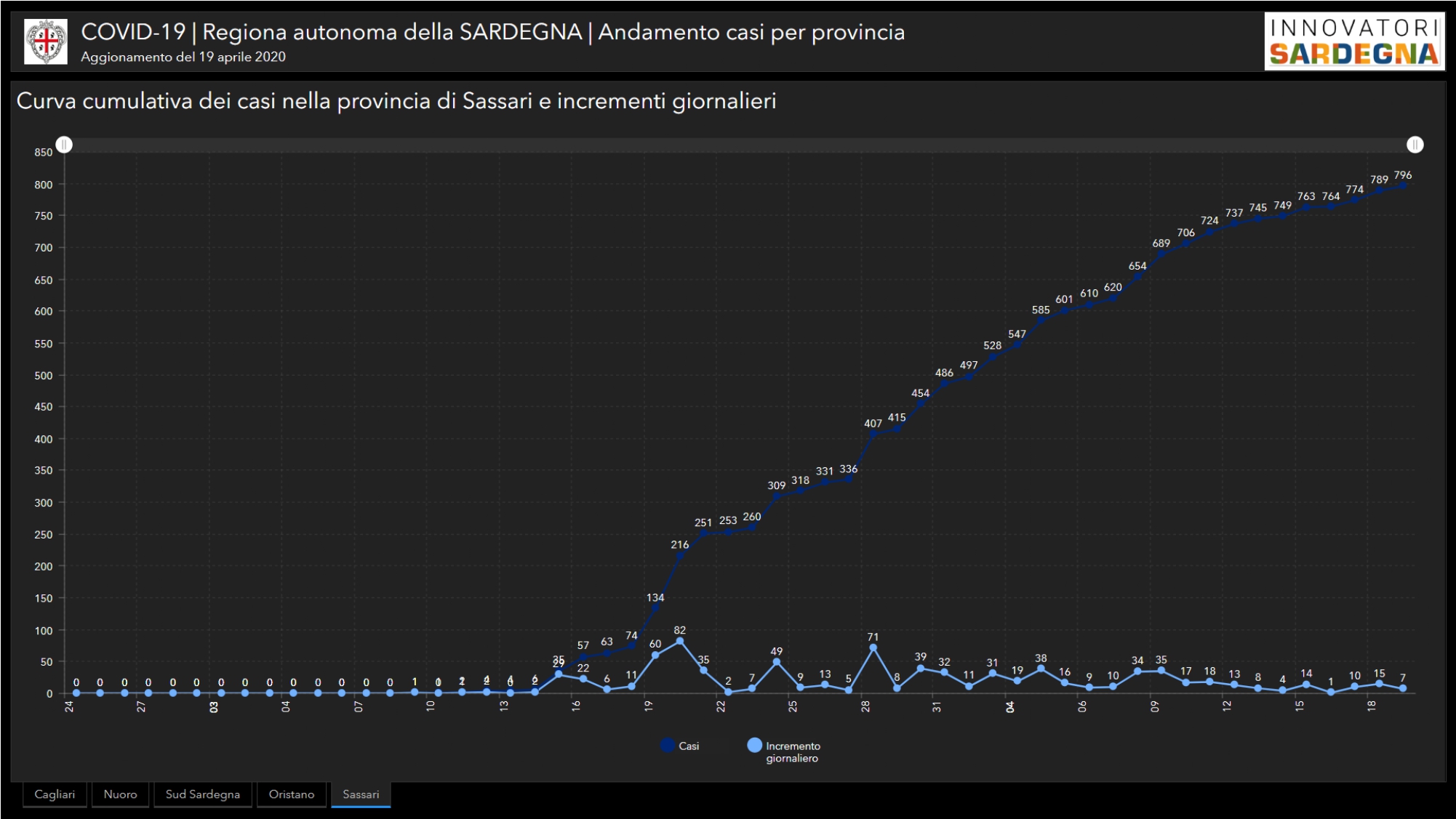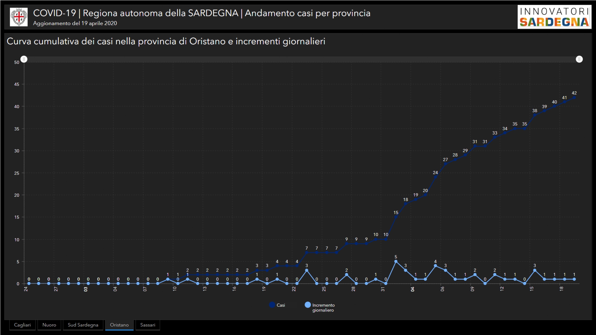 Sul territorio, dei 1.215 casi positivi complessivamente accertati, 217 sono stati registrati nella Città Metropolitana di Cagliari (+5 rispetto all’ultimo aggiornamento), 86 nel Sud Sardegna, 42 (+1) a Oristano, 74 a Nuoro (+4), 796 (+7) a Sassari.