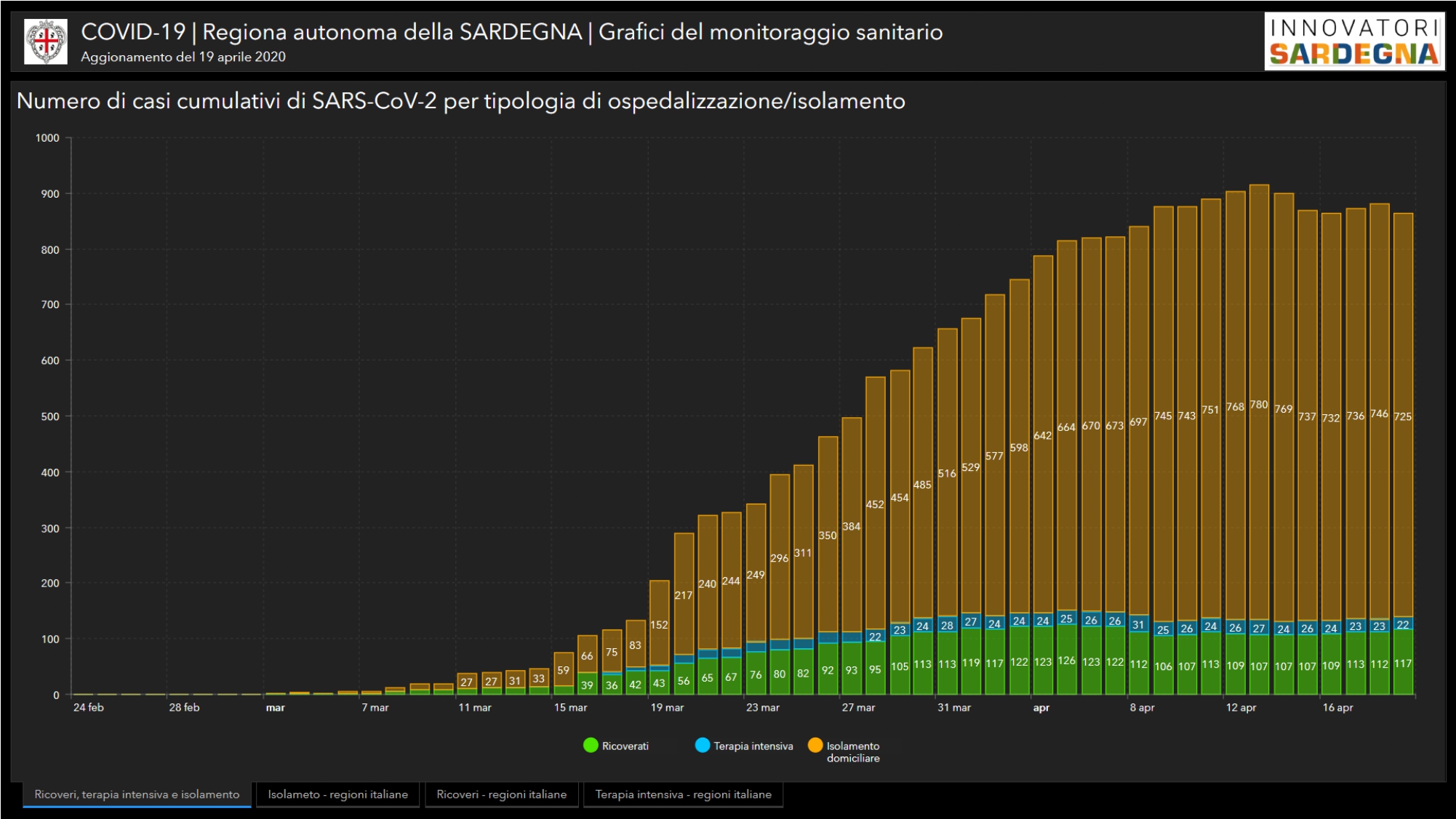 È quanto rilevato dall’Unità di crisi regionale nell’ultimo aggiornamento. In totale nell’Isola sono stati eseguiti 14.859 test. I pazienti ricoverati in ospedale sono in tutto 139, di cui 22 in terapia intensiva, mentre 725 sono le persone in isolamento domiciliare. Il dato progressivo dei casi positivi comprende 220 pazienti guariti, più altri 45 guariti clinicamente. Resta invariato il numero dei decessi (86).
