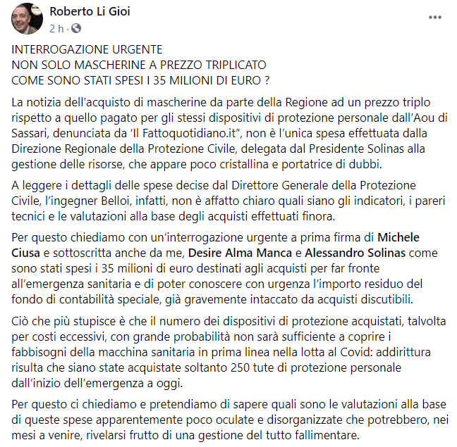 “A leggere i dettagli – scrive Li Gioi – delle spese decise dal Direttore Generale della Protezione Civile, l’ingegner Belloi, infatti, non è affatto chiaro quali siano gli indicatori, i pareri tecnici e le valutazioni alla base degli acquisti effettuati finora. Per questo chiediamo con un’interrogazione urgente a prima firma di Michele Ciusa e sottoscritta anche da me, Desire Alma Manca e Alessandro Solinas come sono stati spesi i 35 milioni di euro destinati agli acquisti per far fronte all’emergenza sanitaria e di poter conoscere con urgenza l’importo residuo del fondo di contabilità speciale, già gravemente intaccato da acquisti discutibili”.