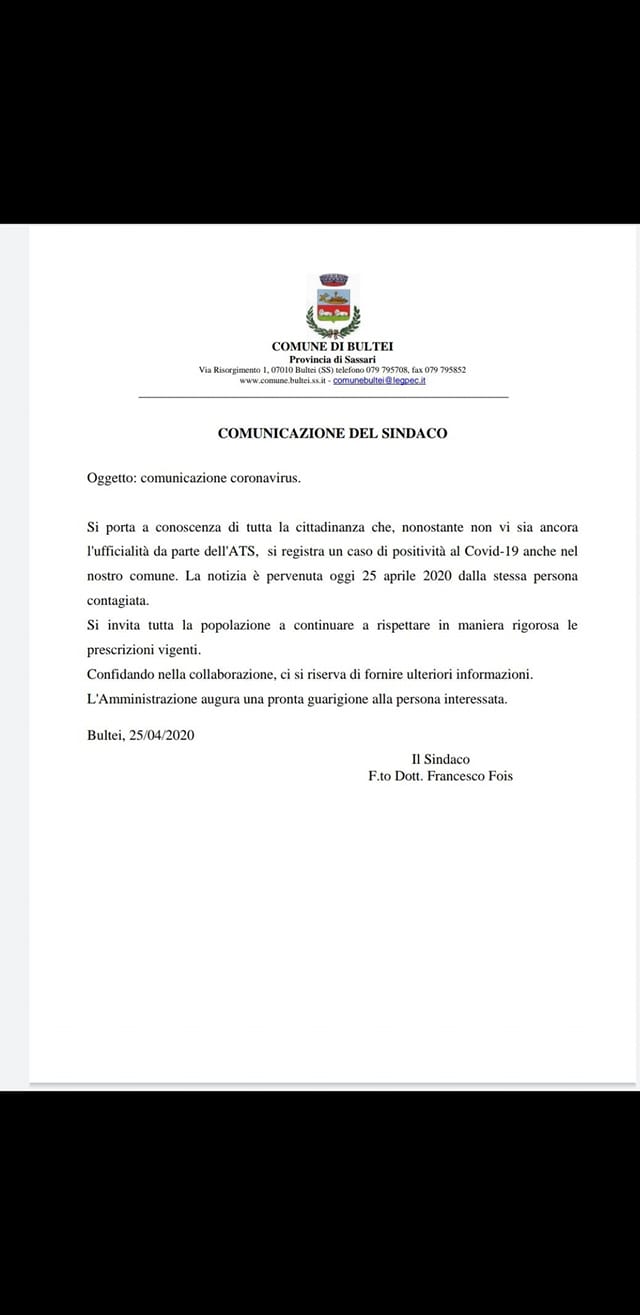 “Non c’è da allarmarsi, sta bene, è a casa – assicura – e il servizio sanitario sta adottando tutte le misure necessarie alla salvaguardia della salute pubblica”. Il sindaco riferisce poi che “le forze dell’ordine sono state invitate a intensificare il controllo del territorio comunale, per far rispettare le misure emanate da Governo e Regione”. La comunicazione segue di poco quella del sindaco di Bultei, Francesco Fois, che dà conto del primo caso nella piccola comunità che guida, tra i primissimi in tutto il Goceano. Fois spiega di aver saputo della positività dal diretto interessato: si tratta di un operatore sanitario che si è isolato nella propria casa in campagna, all’ingresso del paese. Primo caso anche a Osilo, alle porte di Sassari in direzione dell’Anglona e dell’Alta Gallura. Si tratta di un ospite della comunità alloggio Regina Elena. Il sindaco Giovanni Ligios riferisce di aver “immediatamente contattato telefonicamente l’Unità di crisi e i gestori della struttura per l’adozione dei protocolli di sicurezza”. La persona risultata positiva non ha sintomi, sta bene e osserva le procedure di isolamento previste.