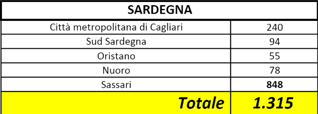 Sul territorio, dei 1.315 casi positivi complessivamente accertati, 240 sono stati registrati nella Città Metropolitana di Cagliari (+1 rispetto all’ultimo aggiornamento), 94 nel Sud Sardegna, 55 a Oristano, 78 (+1) a Nuoro, 848 a Sassari.