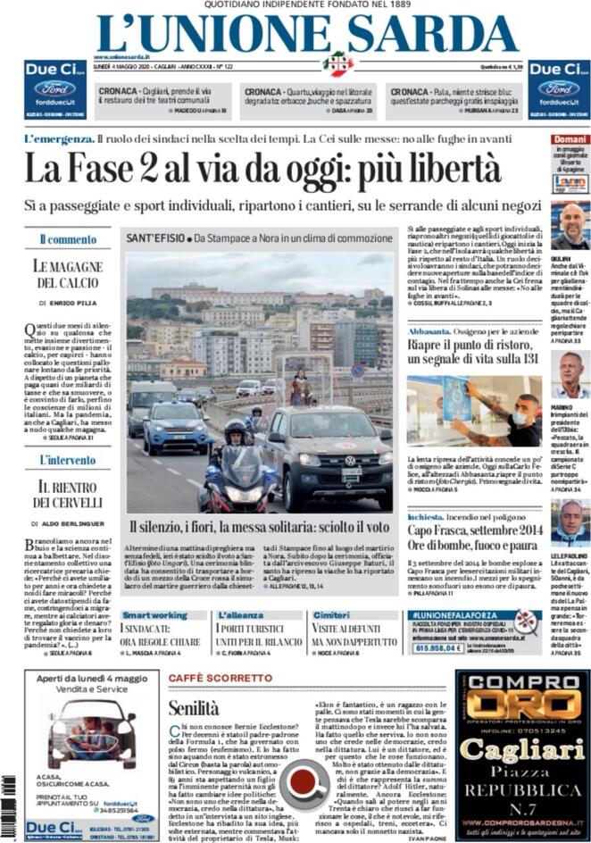 Uncategorized Rassegna stampa 04.05.2020 Rassegna stampa 04.05.2020 Da Redazione Cagliaripad - 4 Maggio 2020 ARTICOLI CORRELATIALTRI ARTICOLI DA QUESTO AUTORE Uncategorized “Passerella rovina dune a La Caletta”, esposto cittadini Uncategorized Sardegna: da oggi sei Province e due Città metropolitane Uncategorized Comunali: slittano in autunno anche in Sardegna Uncategorized Muravera, nasce in villaggio turistico area dedicata a ospiti con disabilità Uncategorized Laconi: litigio tra automobilisti, un denunciato per danneggiamento e minacce Uncategorized Cagliari, occhio alle multe: ecco gli autovelox del mese di aprile 2021 - Pubblicità - Ultime notizie Gimbe: “Sardegna agli ultimi posti in Italia per ciclo vaccinale completato” 31 Marzo 2021 Covid in Sardegna, Gimbe: “In una settimana casi in aumento del 56,8%” 31 Marzo 2021 Festino ‘clandestino’ a Cagliari: 12 sanzioni una denuncia 31 Marzo 2021
